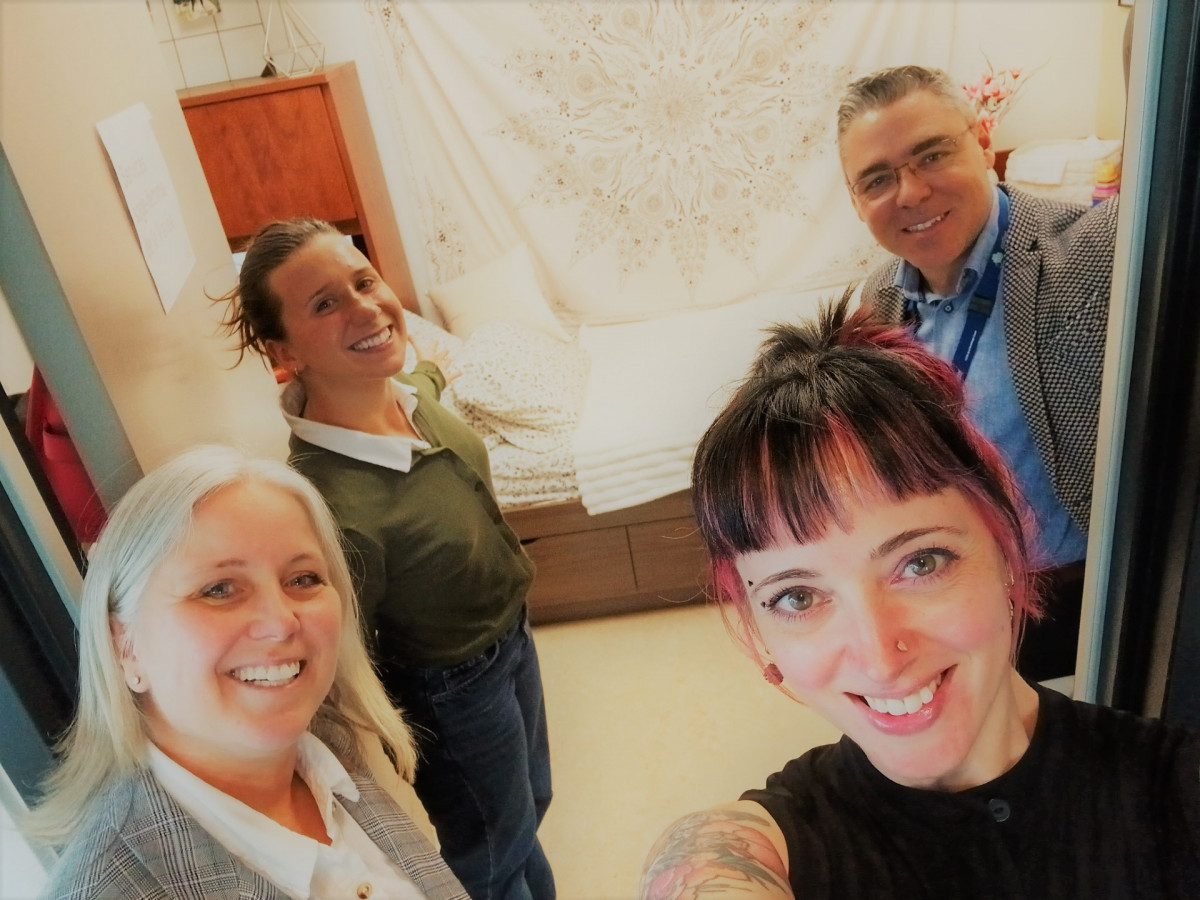 De gauche à droite : Isabelle Papineau, directrice des programmes Jeunesse et des Activités de santé publique, Myriam Beauregard, étudiante sage-femme, Dominique Pilon, président-directeur général du CISSS de la Montérégie Ouest et Geneviève Poirier, sage-femme.
